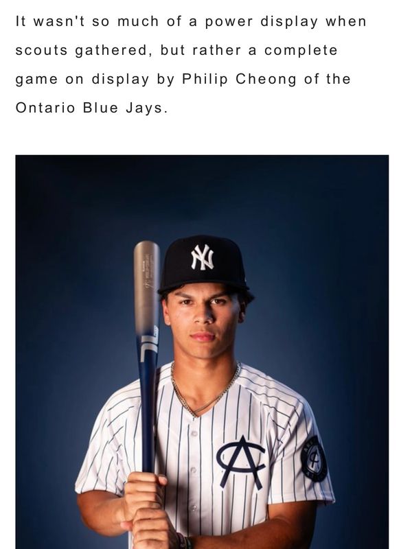 Playing for the New York Yankees Cheong (Richmond Hill, Ont.), went 2-for-3 with two stolen bases, an RBI, and he scored the tying run. In a 3-2 win over the Cincinnati Reds Scout Team.